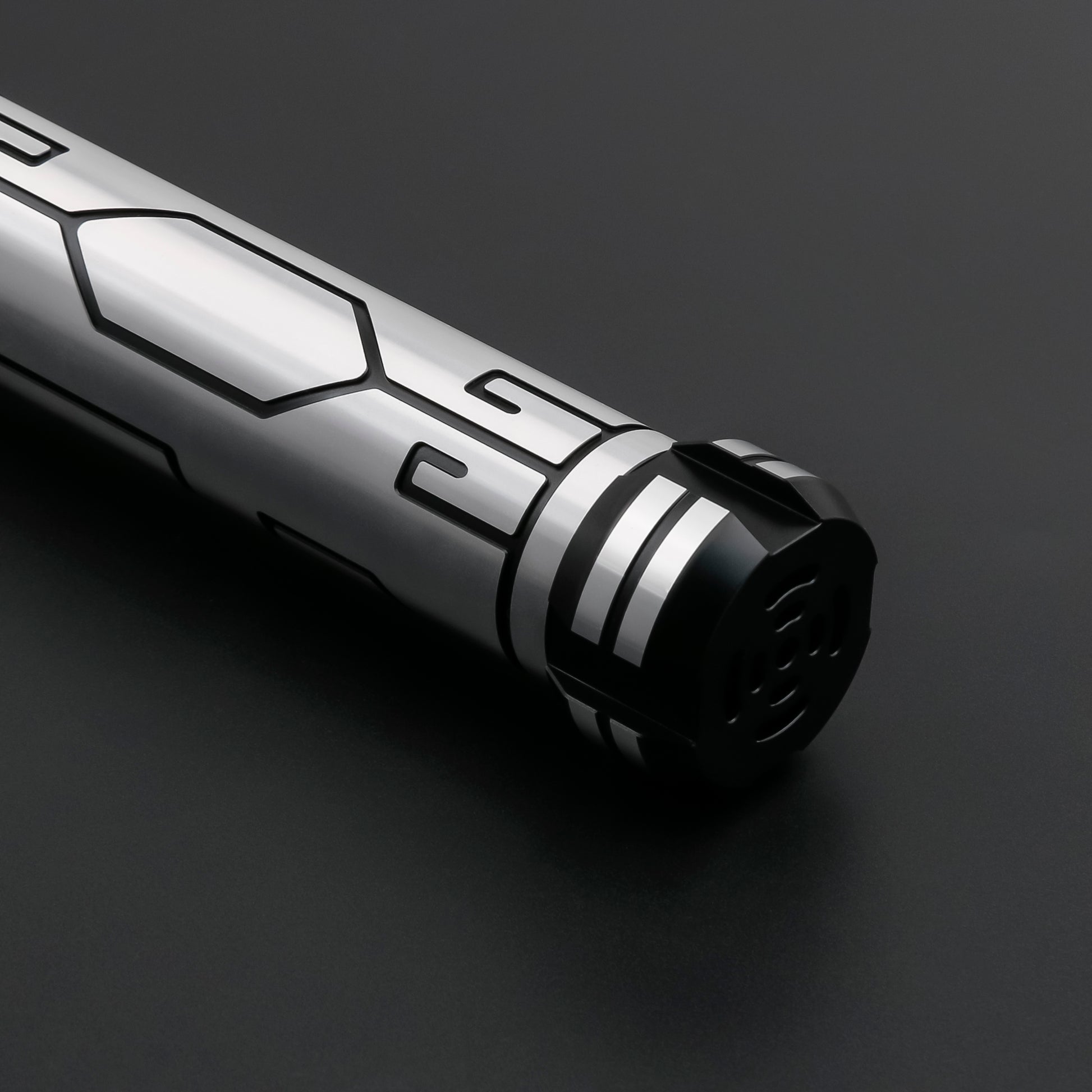 The lightsaber's handle is designed to be particularly durable and conveys a feeling of reliability and strength with robust materials and an ergonomic design. The clean lines and tactical elements of the handle make it a reliable weapon in the hands of the fighter.